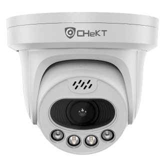 The CHeKT 4MP IR AI turret Camera with a low-light night color lens for clear full color images at night and warm white LEDs lights and Red/Blue lights for active deterrence. It’s equipped with a built-in microphone and a 3-watt speaker for two-way audio communication. Includes advanced AI analytics like intrusion detection, line crossing, loitering alerts, and people counting. With a 12V power output and onboard alarm input, it supports direct sensor integration, while its IP66-rated housing ensures reliable outdoor performance in any weather.